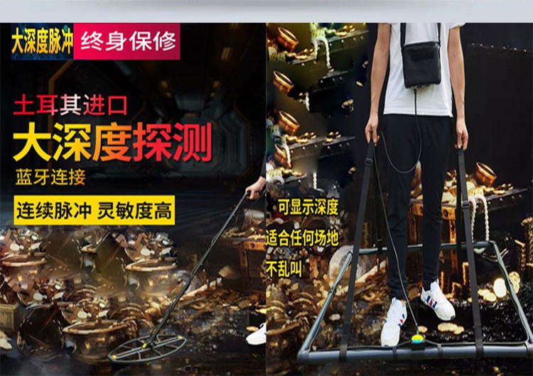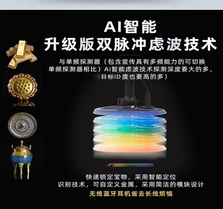 升級雙脈沖,智能化識別,一機五用,含四根探測線(xiàn)圈,手持探盤(pán),加長(cháng)型探棒,無(wú)線(xiàn)耳機等,可單框與立體框雙用!更加人性化,探測定位準確!